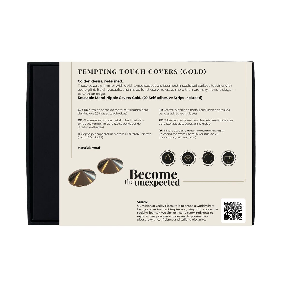 Whether paired with lingerie, layered beneath sheer fabric, or worn on bare skin as the ultimate finishing touch, the gold-coloured Tempting Touch Covers invite attention, ignite curiosity, and command the room.